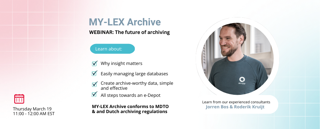 During this webinar, we will show how MY-LEX Archive helps to regain control. Not by adding extra complexity, but by bringing information together into a single coherent whole, while archive functions provide a manageable environment in which to work towards destruction or transfer. This also provides insight into quality, completeness and timeliness, and makes it easier to work in accordance with MDTO and the requirements of the Archives Act, while the information remains available to the organisation.